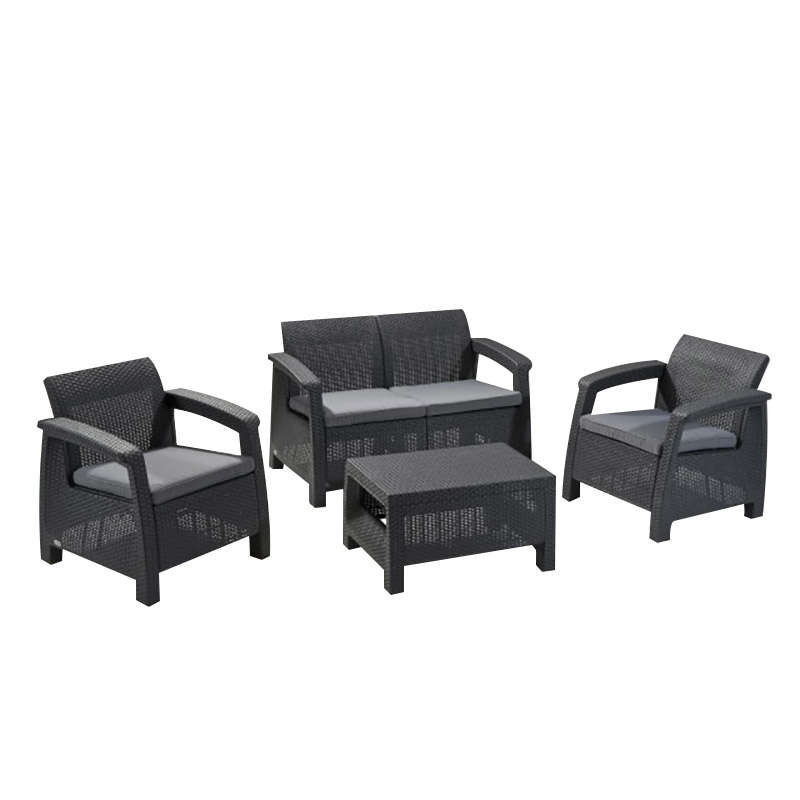 Corfu σετ K/D του οικου Keter σε χρώμα ανθρακί.Ένα κλασικό σετ με ιδιαίτερη πλέξη στην πλάτη και τα πόδια.Το σετ συμπεριλαμβάνει 1 2θεσιο καναπέ και 2 πολυθρόνες μαζί με μαξιλάρια και 1 τραπέζι.Κατάλληλο για εσωτερικό και εξωτερικό χώρο.