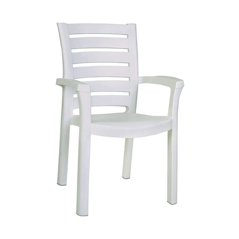 MARINA πολυθρόνα του οίκου Siesta σε χρώμα λευκό. Ένα διαχρονικό κάθισμα με μπράτσα για την βεράντα και τον κήπο σας. Διαθέτει αντιολισθητικές τάπες στα πόδια, στοιβαζόμενη.