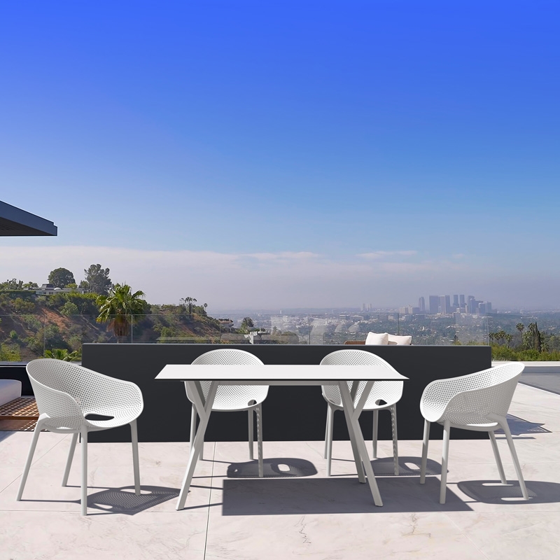 Set max τραπέζι 140X80 με 4 πολυθρόνες Sky Pro σε χρώμα white του οίκου Siesta. Κατασκευασμένα από πολυπροπυλένιο για απόλυτη αντοχή. Ένα set με ιδιαίτερο desing και άριστη κομψότητα ιδανικό για επαγγελματική και για οικιακή χρήση. Κατάλληλο για εσωτερικό και εξωτερικό χώρο.Το τραπέζι διατίθεται σε χρώμα white και η επιφάνεια του είναι HPL 12mm.