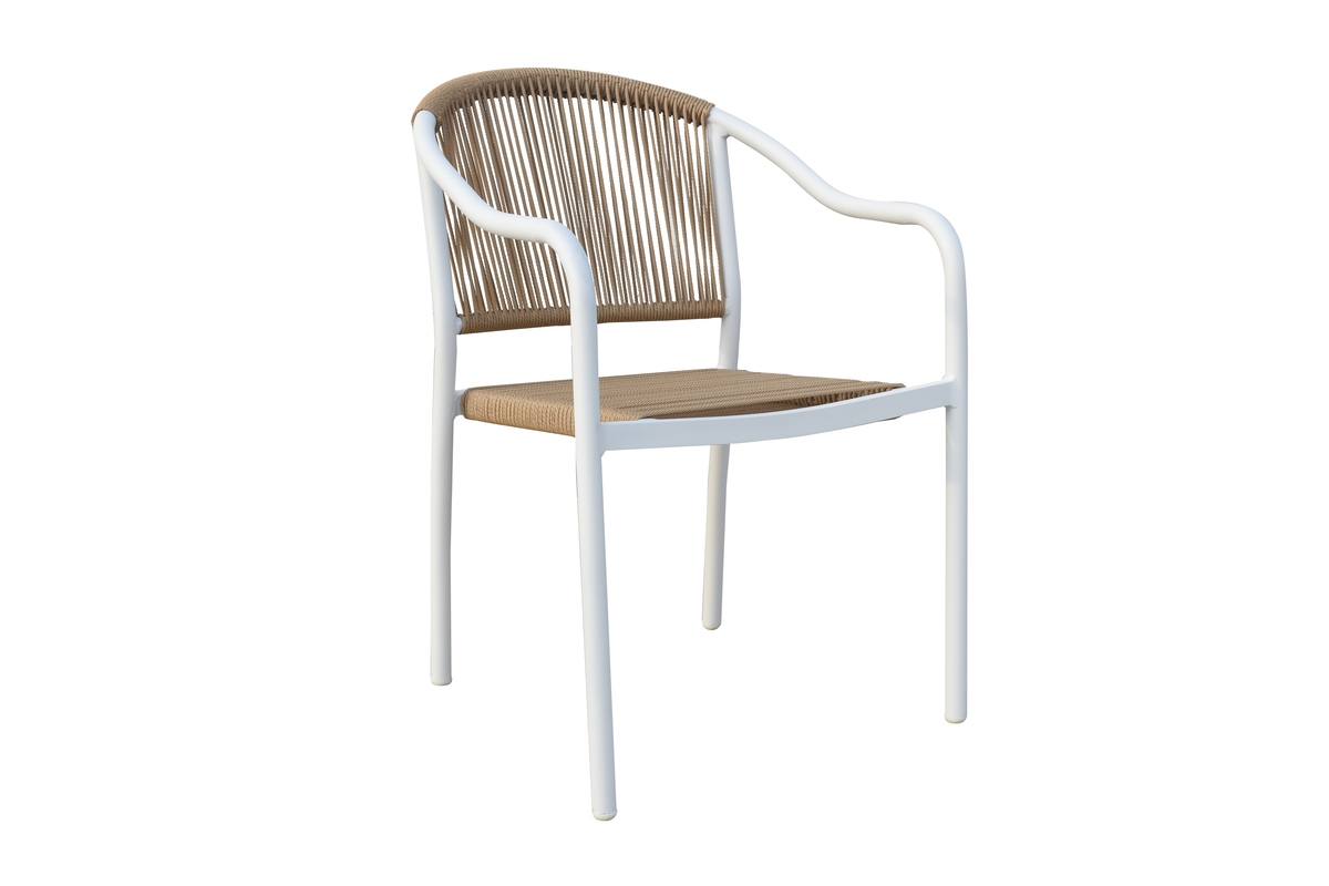 Martel πολυθρόνα αλουμινίου με σκελετό βαφής σε χρώμα white με μοντέρνο design.Η πλάτη και το κάθισμα είναι με επένδυση από συνθετικό σχοινί σε χρώμα μπέζ. Με στρογγυλεμένη πλάτη για μεγαλύτερη άνεση. Είναι στοιβαζόμενη για εύκολη αποθήκευση και κατάλληλη για εξωτερική χρήση.