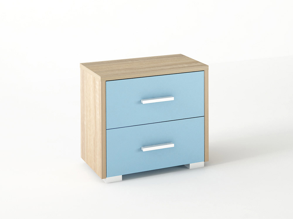 Κομοδίνο παιδικό από ενισχυμένο σκελετό μελαμίνης(πάχους 18mm) υψηλής ποιότητας σε χρώμα δρυς-σιέλ, κατάλληλο για να πλαισιώσετε το παιδικό κρεβάτι και να οργανώσετε το χώρο. Διαθέτει 2συρτάρια με μηχανισμό για να τοποθετήσετε μικροαντικείμενα, ρούχα ή λευκά είδη ώστε να δημιουργήσετε ένα λειτουργικό χώρο.