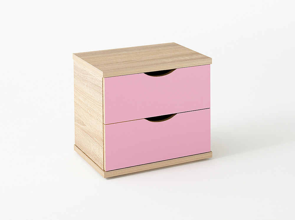 Κομοδίνο από ενισχυμένο σκελετό μελαμίνης άριστης ποιότητας και ελληνικής προελεύσεως, σε χρώμα δρυς-ροζ. Διαθέτει 2 συρτάρια με μηχανισμό φρένου, κατάλληλο για να πλαισιώσετε το παιδικό ή εφηβικό δωμάτιο συνδυάζοντάς το και με τα υπόλοιπα προϊόντα της σειράς και να δημιουργήσετε ένα όμορφο και λειτουργικό περιβάλλον για το παιδί σας.