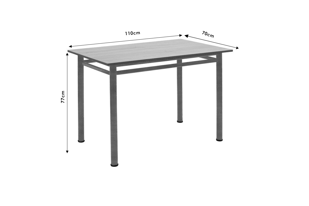 Τραπέζι κατασκευασμένο από σταθερό μεταλλικό σκελετό σε λευκό χρώμα και επιφάνεια από μελαμίνη εξαιρετικής ποιότητας και αντοχής στη φθορά και στο χρόνο σε δρυς χρώμα. Τα τελειώματα των ποδιών έχουν πλαστικά πέλματα για την προστασία του πατώματος από ανεπιθύμητες φθορές. Ιδανική και πρακτική επιλογή που θα ανανεώσει τη διακόσμηση του χώρου που θα το τοποθετήσετε και θα βοηθήσει στην οργάνωσή του. Κατάλληλο για τον προσωπικό και τον επαγγελματικό σας χώρο.